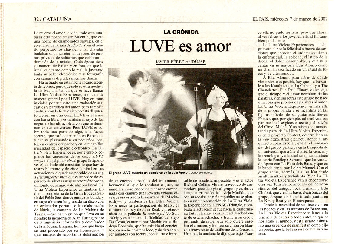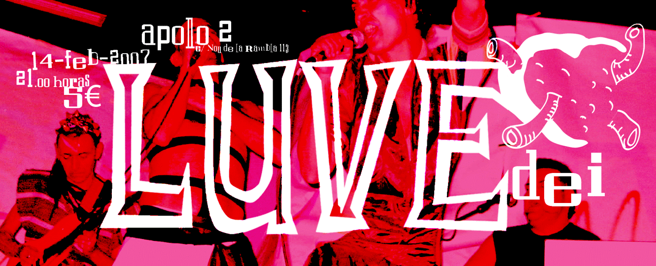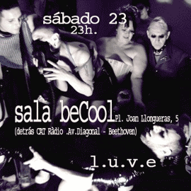 viernes 9.mar.2007 - 21.30 - l.u.v.e. @ la boite - madrid > sábado 10.mar.2007 - 22:00 - l.u.v.e. @ luz de luna - tomelloso [ cancelado ] | > dissabte 24.feb.2007 - 21:30 - luve @ soles negros- la escocesa / bcn poble nou | > dimecres 14.febrer.2007 - 21:00 - l.u.v.e. dei @ apolo 2 | > dissabte 20 gener. 2007 - mitjanit - l.u.v.e. @ indyfesta 6è aniversari | > bcn 23 des, 2006 - luve @ becool | >